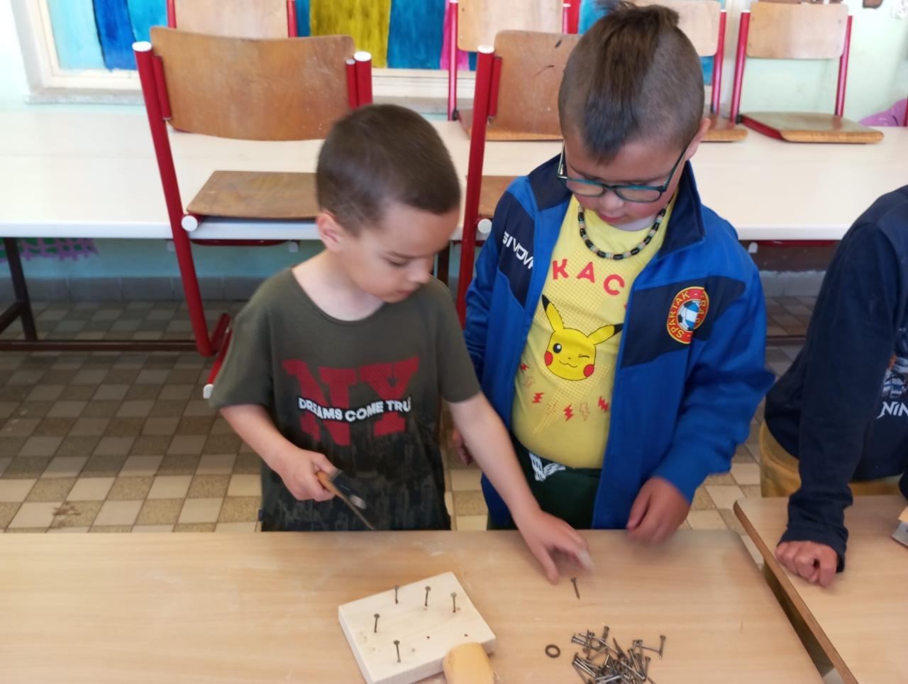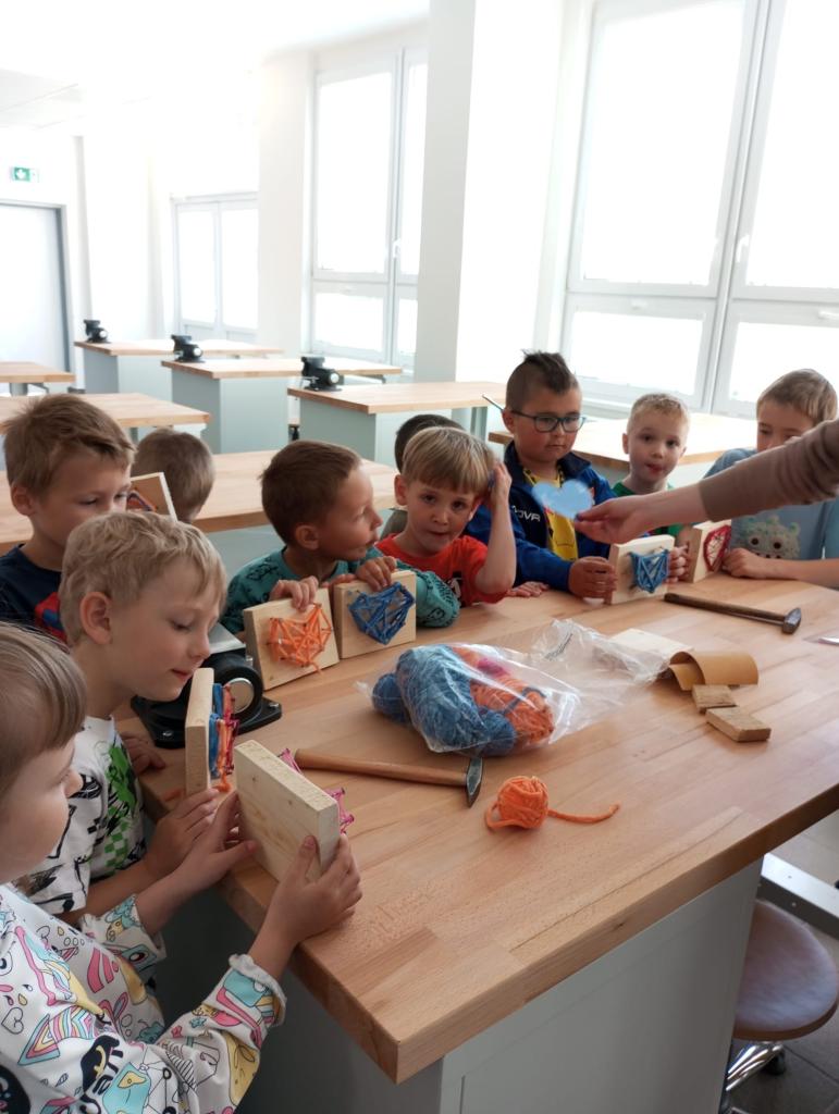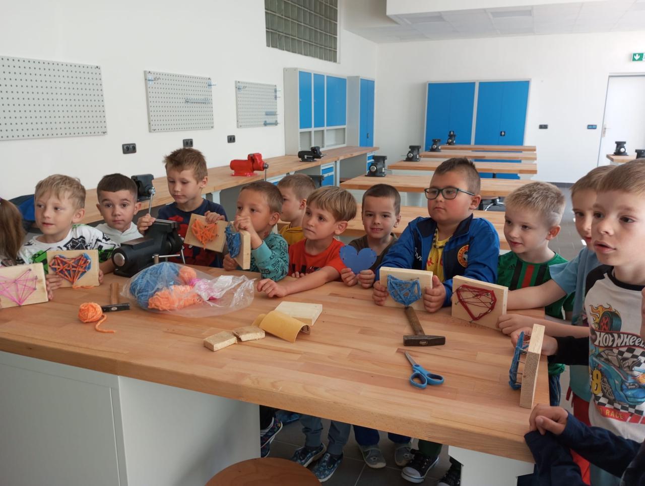 Naši předškoláci ze třídy Sluníček a Myšáků se vypravili do dílen ZŠ. Hned ve dvěřích je přivítal pan učitel T.Koudelka, který dětem ukázal nové dílny, kde pracují velcí školáci. Poté šly děti do vedlejších dílen, kde jim pan učitel vysvětlil, co budou společně vytvářet. Děti si vyzkoušely práci s brusným papírem, kladivem a na závěr obmotovály již zatlučené hřebíky barevnou vlnou. Do školky si tak mohly odnést krásná srdíčka, která nyní dětem dělají parádu v šatnách jejich tříd.