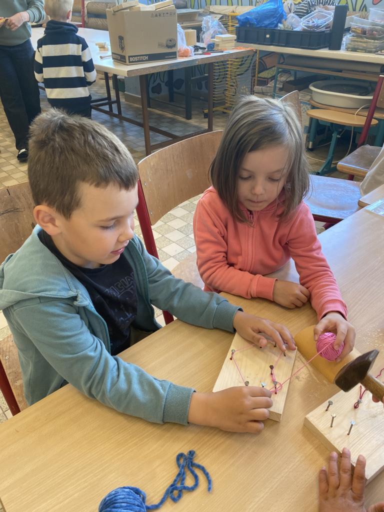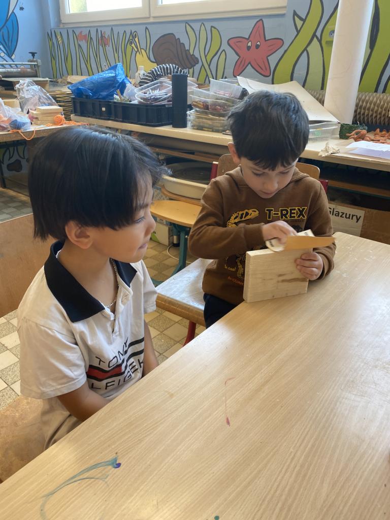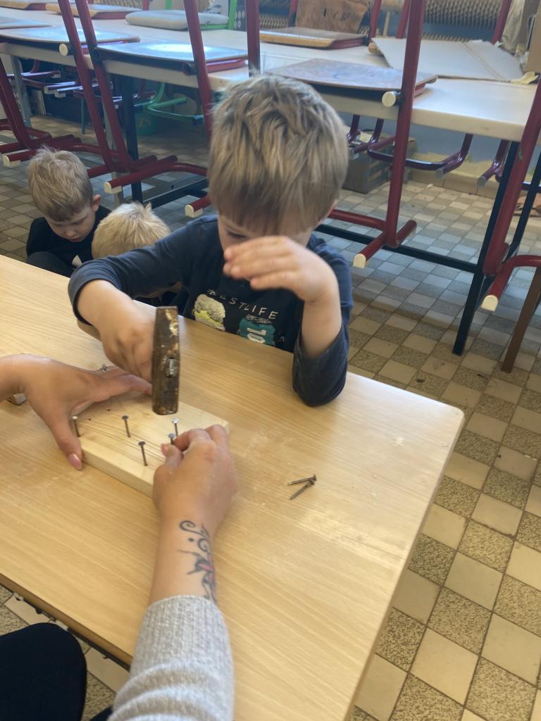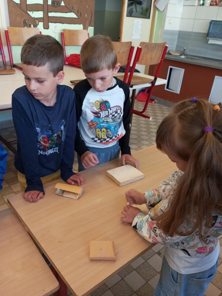 Naši předškoláci ze třídy Sluníček a Myšáků se vypravili do dílen ZŠ. Hned ve dvěřích je přivítal pan učitel T.Koudelka, který dětem ukázal nové dílny, kde pracují velcí školáci. Poté šly děti do vedlejších dílen, kde jim pan učitel vysvětlil, co budou společně vytvářet. Děti si vyzkoušely práci s brusným papírem, kladivem a na závěr obmotovály již zatlučené hřebíky barevnou vlnou. Do školky si tak mohly odnést krásná srdíčka, která nyní dětem dělají parádu v šatnách jejich tříd.